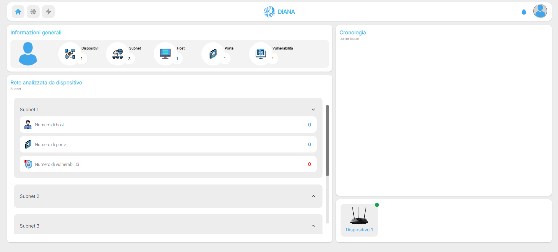 Un primo sguardo alla dashboard di Diana: dati chiari, analisi in tempo reale e controllo completo della tua rete, tutto a portata di mano.