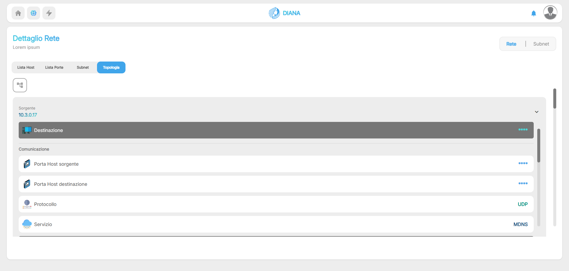 La dashboard di Diana mostra in tempo reale lo stato della rete aziendale: dispositivi attivi, vulnerabilità rilevate, traffico sospetto e livello di esposizione. Ogni dato è organizzato in modo chiaro e intuitivo, così anche chi non è tecnico può prendere decisioni consapevoli.